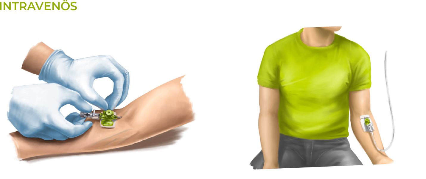Immunglobuline können nicht als Tablette eingenommen werden. Sie würden im Magen und Darm abgebaut und damit wirkungslos werden. Daher erfolgt die Behandlung mit Immunglobulinen als Infusion entweder intravenös, also in die Vene (= IVIg, intravenöse Immunglobuline), oder subkutan unter die Haut (= SCIg, subkutane Immunglobuline).